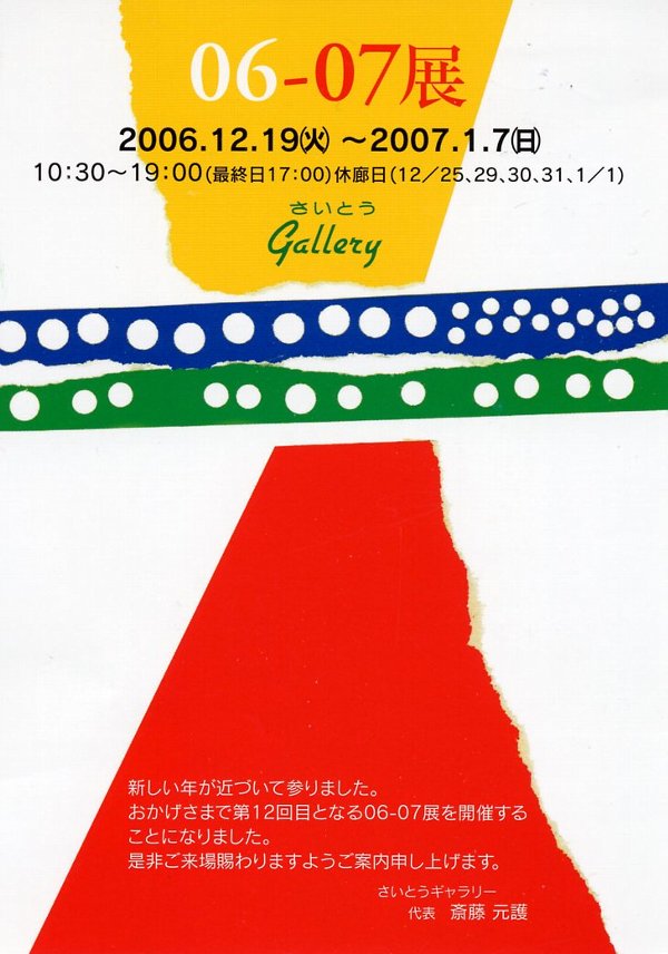■「06-07展」 会場:さいとうギャラリー 札幌市中央区南1条西3丁目1番地 ラ・ガレリア5F 011-222-3698 会期:12月19日(火)~1月7日(日) 時間:10:30~19:00(最終日17:00まで) 休廊:12月25、29、30、31、1月1日 さいとうギャラリー恒例の年越し展で、今回で12回目となります。 年末は終了ですが、1月2日から開いております。