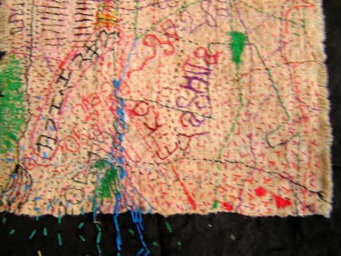 ◆「高橋 靖子絵画展『祝祭へ』」 カフェエスキス 自由美術会員・全道展会員の高橋 靖子さんの個展です。 靖子さんの息子さんがこの会場の喫茶店を訪れて、「魅力的な空間だ」靖子さんに勧めたことから実現した展覧会です。 既発表作品4点と未発表作品が10点程店内の随所に展示してありました。(1・2) 卵のケースに彩色し、本日開始日3月3日にかけてお雛さまの作品を作ったり、高橋 靖子さんらしいユーモアたっぷりの作品も並んでおります。 今回はキャンバスを綿布にし、靖子さん独特の記号や文字をびっしりと刺繍で縫い付けた手間と時間と神経を使う作品を4点展示してあります。 ぜひ観て頂きたい作品だと思います。 中でも圧巻だったのはネパール紙(粗い木の繊維が織り込んだ硬くて厚い紙)に不透明水彩絵の具を塗ったガッシユにコラージュと刺繍をした作品で、魅力的な輝きを放っておりました。 そこには、個展の開始日と終了日の日付や、会場のカフェエスキスの名前を刺繍したりして、自由に遊んでおられるのが面白く拝見しました(部分拡大)。 近所のクリニックに行きがてら訪れたところ、そこには靖子さん本人と、全道展・行動展会員の富田 知子さん、後藤 和子さん、坂本 順子の4人(1・2)が陣取っており、一般のお客さんは少し離れて所に席を取っておりました。 怖かったのでしょうか・・・(笑) 家人のたっての頼みで靖子さんが宝物みたいに大事にしている綿布に刺繍した生地(1・2)を持参しており(部分拡大)、全員興味津々で手にとっておりました。