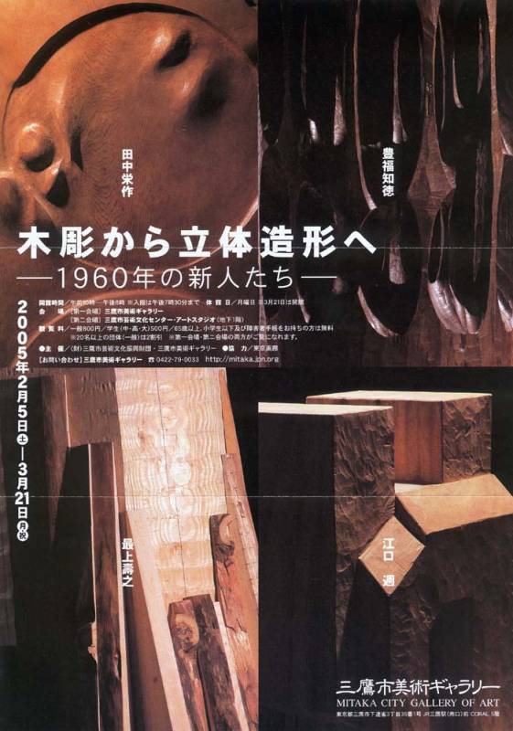 ■「木彫から立体造形へ ―1960年の新人たち―」三鷹市美術ギャラリー 2月5日(土)~3月21日(月) 日本における抽象彫刻への取り組みの歴史はわずか半世紀前、戦後のことだそうです。 1960年は高度経済成長に向かって日本が歩み始めた頃であります。 美術の世界でも新たな表現に向けて様々な試行がなされました。その中で注目されたのは、次々と登場する新しい工業用素材への取り組みでした。 彫刻でもそういった動きの中で、敢て伝統的な素材の木を使うことにこだわった作家たちがいました。 田中 栄作・豊福 知徳・最上 壽之・江口 週 の4人の現役作家に焦点を当てた展覧会の企画です。 彼らの手になる1960年代の作品は今でも古さを感じさせない存在感を放っていることと思います。