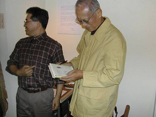写真の方は、露木繁雄さんです。サインしていただいた本は、『カミキリムシの魅力』。この本は4人の共著なのですが、「読んでいるととても楽しく、カミキリムシを捕りにいきたくなっちゃう」本なので大好きなのだそうです。露木さんは穏やかで人を惹きつける魅力のある方だそうです。 |
