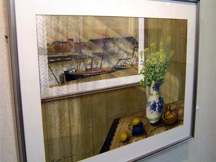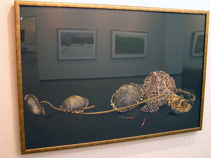 作品の中の映像、かえって会場の雰囲気が伝わっているのではないでしょうか。カメラの問題でなく、実際いくつかの作品は強く反射してましたね。作品が大きいだけ、写りやすい一様な暗い背景が広いだけ、映像も迫力ありましたね。『絵の中の絵』というか、何気に後を振り向いたり、逆に作品に食いいったりしました。画家も静物画の背景をそういう想いで描いたんでは、などと思ったりしました。夫氏もその辺はわきまえての展示なのでしょう。 |