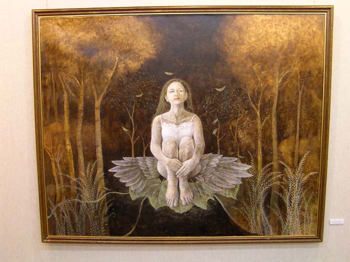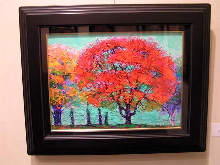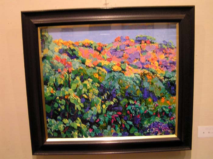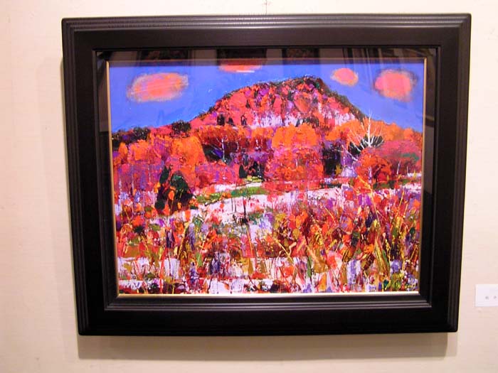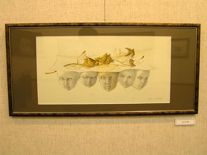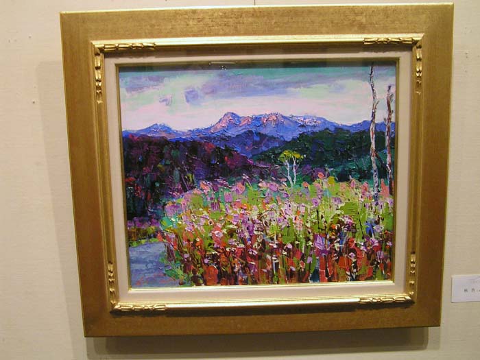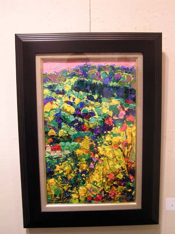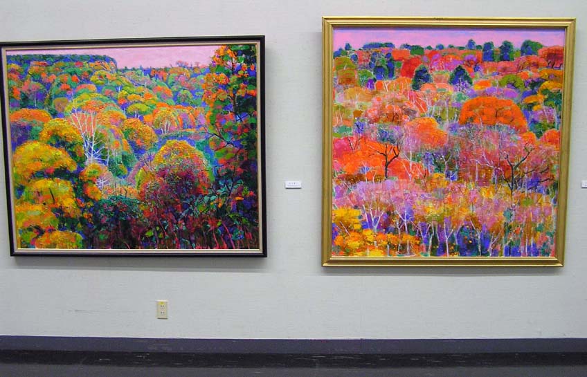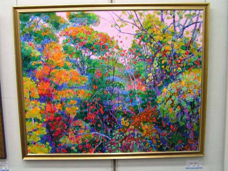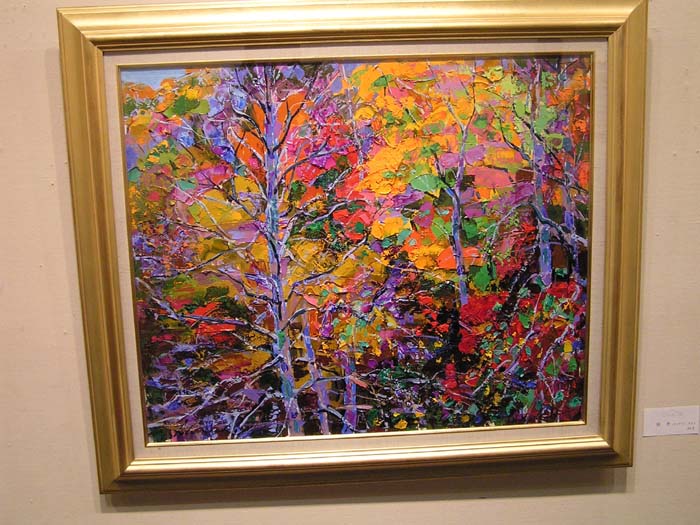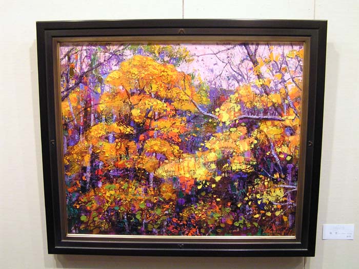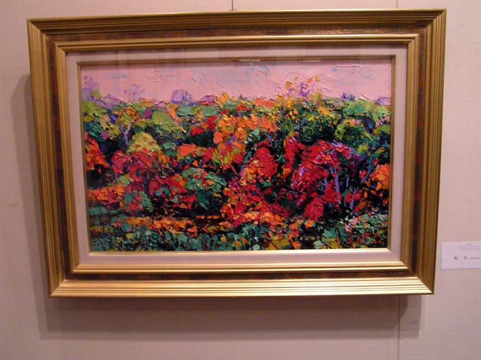 紅葉と言へば秋だ。彼の世界は冬でも、春でも、夏でも全然違和感がない。昨年の道展の作品には特に驚かされた。紅葉の表現主義者だ。今春の『札幌美術展』に、その延長を期待をしたが、少し違っていた。図録をみると2002・2003 年の作品だ。穏やかになるであろう、グループ展ということを意識して、華やかで完結的な作品を上梓したのだろう。D.M.の写真を見ると、やはり表現的傾向の強い作品に見える。前回の個展、二度も行った。愛妻にも彼の作品を見せてあげよう。 |