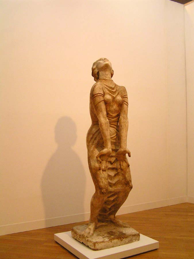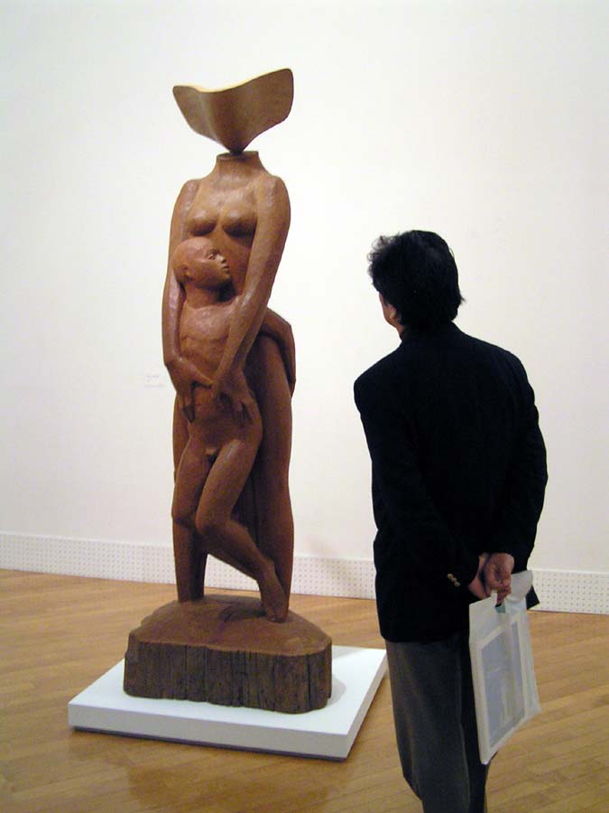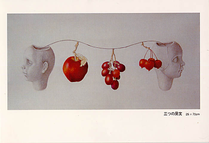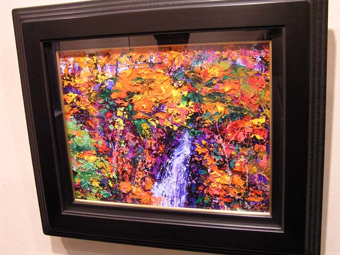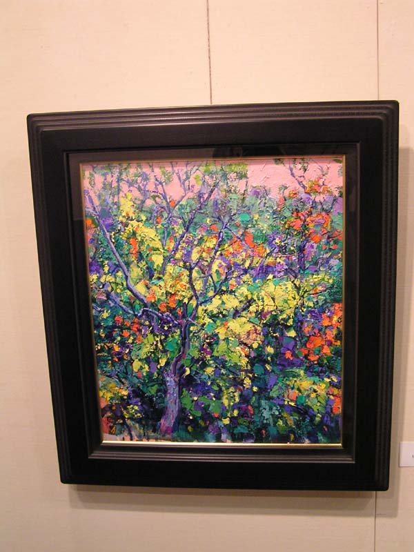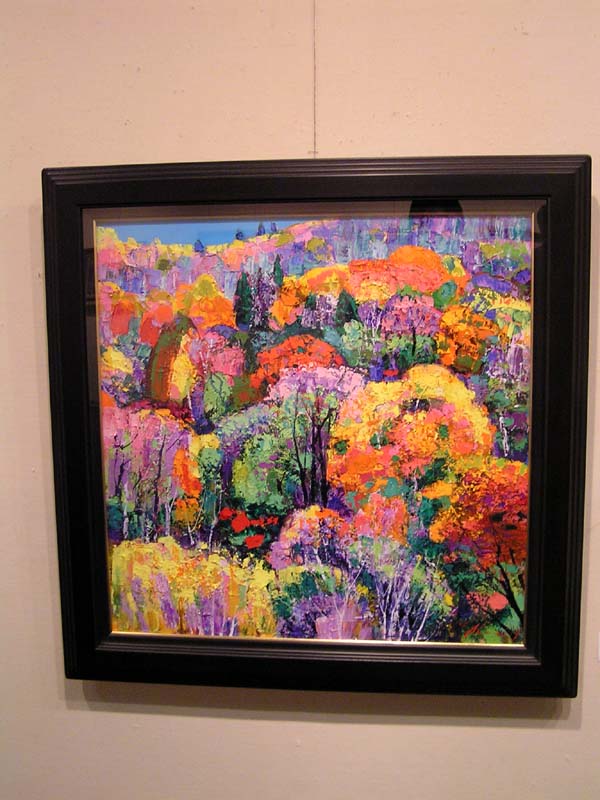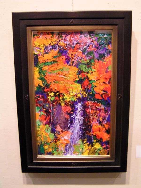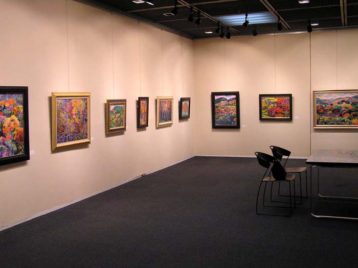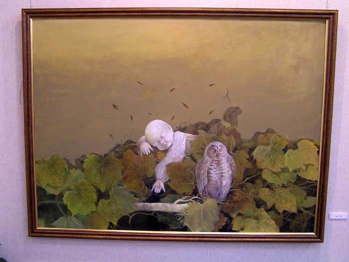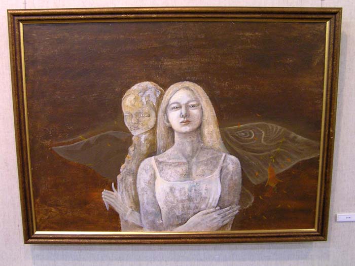 紅葉と言へば秋だ。彼の世界は冬でも、春でも、夏でも全然違和感がない。昨年の道展の作品には特に驚かされた。紅葉の表現主義者だ。今春の『札幌美術展』に、その延長を期待をしたが、少し違っていた。図録をみると2002・2003 年の作品だ。穏やかになるであろう、グループ展ということを意識して、華やかで完結的な作品を上梓したのだろう。D.M.の写真を見ると、やはり表現的傾向の強い作品に見える。前回の個展、二度も行った。愛妻にも彼の作品を見せてあげよう。 |