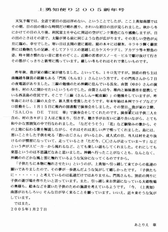 | 上勇知便り 投稿者:竜馬@管理人 投稿日:2005/02/02(Wed) 23:18 No.2520 |