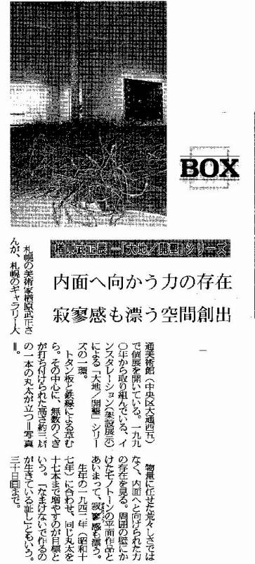 今、大通美術館で、楢原武正展をやっている。2週間の企画展である。30日(日)までである。道新のbox氏が紹介すると思っていたが、今回は見送りのようだ。 |