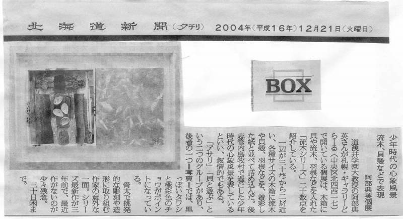 | 阿部 典英展を新聞で紹介 投稿者:竜馬@管理人 投稿日:2004/12/23(Thu) 21:47 No.2346 |