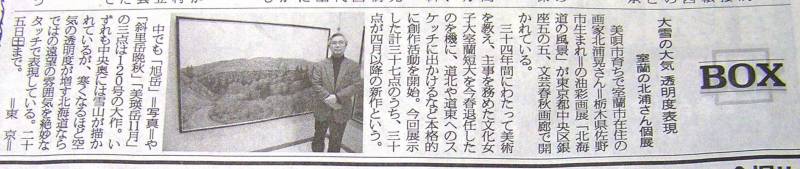 ◆「北浦 晃 油絵個展」(文芸春秋画廊)も昨日で終わり、本日あたり帰宅でしょう。本人に「お騒がせしました」とメールを入れようかと思い掲示板を開いたら、展覧会の様子をさきに詳しく紹介して下さった竜馬@管理人さまが、なんと道新夕刊の紹介記事までデジカメで掲示して下さっていたのには驚きました。 |