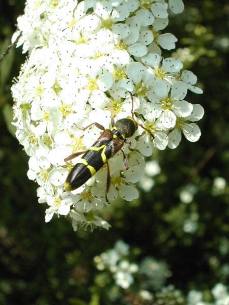 写真のカミキリムシは、その通りキスジトラカミキリです。平地でも普通にいるカミキリですが、わが家で見つけたのは初めてです。5月~7月頃、日本全土で広葉樹の伐採木や白い細かな花に来ます。 |