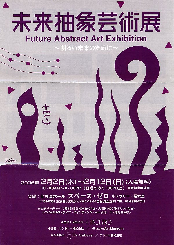 「未来抽象芸術展」は昨日初日を迎えました。立体作品も交えて21名の作家が出品し、様々な作品が集まりました。この会場は地下1、2階に展示スペースがあり、展覧会以外では各種のショーや演劇などにも使われているようです。2/5(日)3:00~5:00PMまで交流パーティーがあり、津軽三味線とのライブ・ペインティングも予定していますので、皆様どうぞお越し下さい。 |