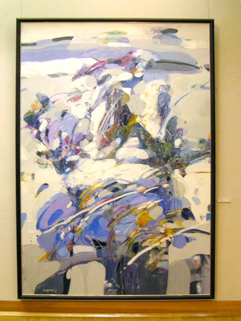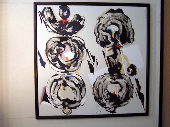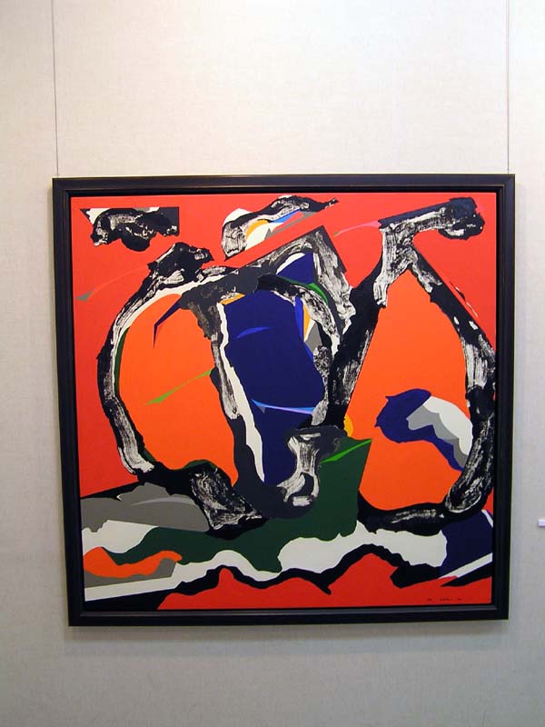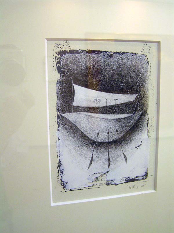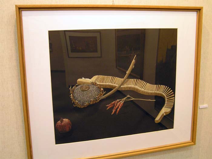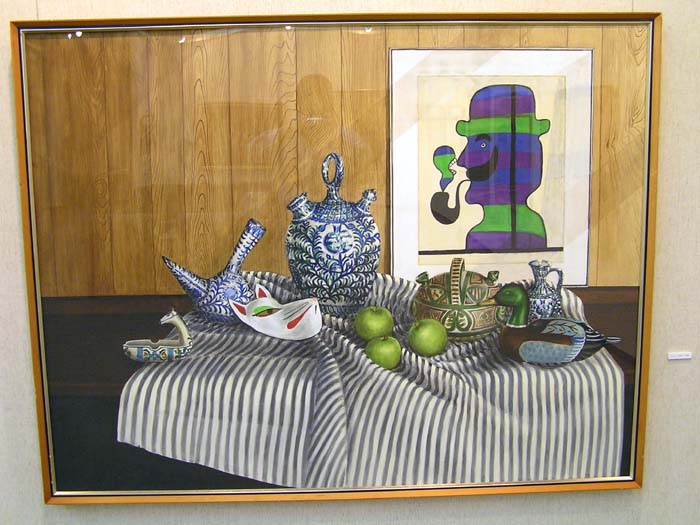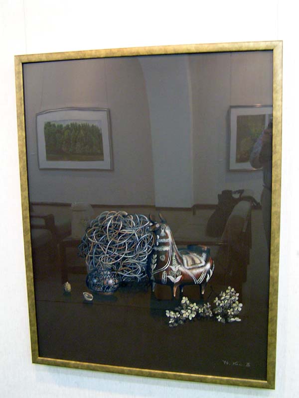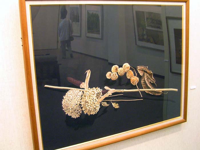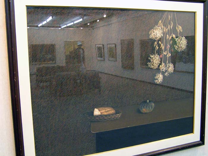 作品の中の映像、かえって会場の雰囲気が伝わっているのではないでしょうか。カメラの問題でなく、実際いくつかの作品は強く反射してましたね。作品が大きいだけ、写りやすい一様な暗い背景が広いだけ、映像も迫力ありましたね。『絵の中の絵』というか、何気に後を振り向いたり、逆に作品に食いいったりしました。画家も静物画の背景をそういう想いで描いたんでは、などと思ったりしました。夫氏もその辺はわきまえての展示なのでしょう。 |